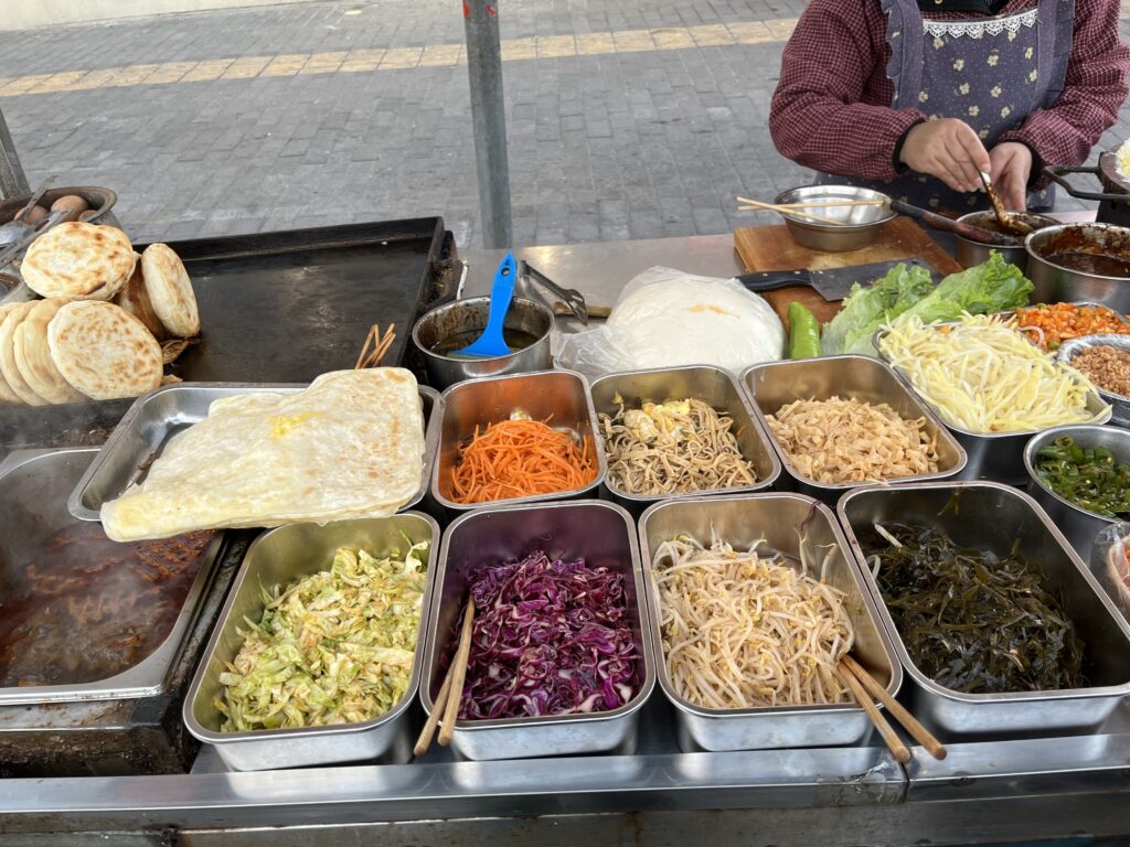 朝食はホテルの近所で屋台があったので、煎餅果子(中国風クレープ)と西安名物の肉夹馍(読み方:ロージャーモウ)をいただきました。